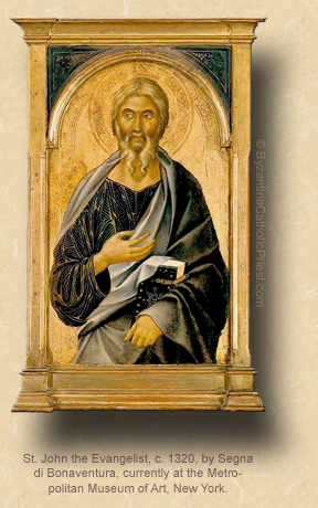 The Apostle and Evangelist John was a native of Bethsaida in Galilee, on the shores of the Sea of Tiberias. His brother was Saint James the Greater, and his parents were Zebedee and Salome. They were a well-to-do family of fishermen when they met our Lord. John had been a disciple of John the Baptist, and in his Gospel he tells the story of how he and Andrew had been with him when he was baptizing one day at the River Jordan when Jesus walked by. The Baptist pointed to our Lord and said “Behold the Lamb of God” (John 1: 36). The Evangelist then goes on to tell us: "The two disciples heard him say it, and they followed Jesus. Turning, and seeing them follow him, Jesus asked, What would you have of me? Rabbi, they said (a word which means Master), where dost thou live? He said to them, Come and see; so they went and saw where he lived, and they stayed with him all the rest of the day, from about the tenth hour onwards” (John 1: 37-39 Knox).