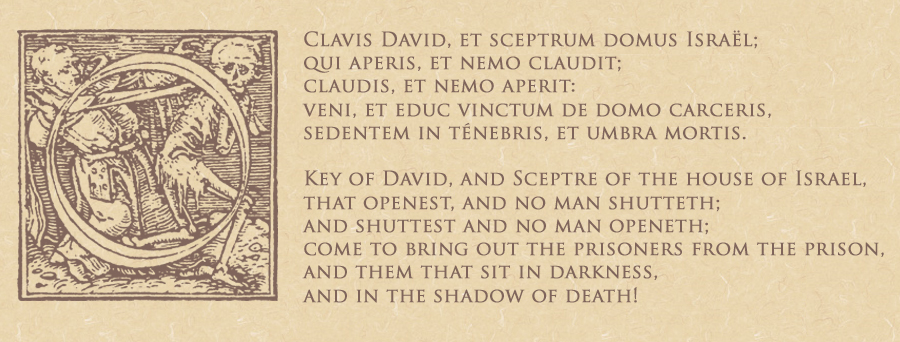 * The Greater Antiphons sung at Vespers, known as the "O Antiphons," and also serving as the verse before the Gospel in the ordinary form, are ordered and utilized differently between the two forms of the Roman Rite. The banners at the top of the pages for the Days of the Greater Antiphons have been created to reflect the original ordering of the antiphons as used in the extraordinary form. For reference, the usages of the two forms compare thus: