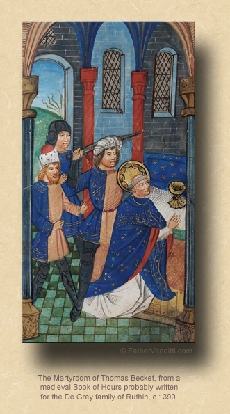 7:14 AM 12/29/2018 — The Commemoration of Saint Thomas Becket hits home, as it seems a frequent theme raised in confession by many souls seeking perfection is the notion that it’s not enough to do the right thing, but to do it with total purity of intention, something I’m not entirely sure is possible. There's a wonderful line in T. S. Elliot's play, Murder in the Cathedral, which tells of Becket’s martyrdom. King Henry II sought to confiscate the property of the Church to finance his war with France; and Becket, who was Archbishop of Canterbury, was accused of treason for excommunicating him as a consequence. It's a scene that takes place the night before he figures the soldiers of the king will come to kill him, and he's being tempted with all kinds of thoughts regarding why he's so willing to die in defense of the rights of the Church. The last temptation he wrestles is the sin of pride: the notion that he's going to his death not because he desires to take a stand for the Church against the state, but because he harbors a secret desire to be canonized a saint. The whole play is written in verse like a poem—which is why it's rarely performed—and he has this wonderful line in which he says, “The last temptation is the greatest treason: to do the right thing for the wrong reason.”