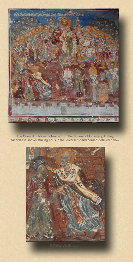 Historians over the centuries have posited that he made a pilgrimage to the Holy Land, that he took part in the Council of Nicea where the Creed we recite every Sunday was composed, that he was imprisoned during the reign of the Emperor Diocletian; and, if we can’t be certain about even these innocuous sounding facts, then what are we to think of the hundreds of miracles and acts of charity attributed to him by popular legend—which is why he is called the Wonder-worker? He’s credited with the setting free of captives, with saving schoolboys from death and young girls from dishonor. We all know the stories about how he supposedly distributed gifts to the poor and paid the dowries of girls so that they could marry and so avoid being sold into slavery. I have somewhere an icon which I used to display in church when I was pastor of a Byzantine parish, which shows him rescuing some sailors caught in a storm at sea, hence his title “Hope of Mariners,” which is just one title out of many. Probably one of the most popular legends about him among Eastern Christians is how, as a bishop in attendance at the Council of Nicaea, as the heretic priest Arius was expounding on his theory that Jesus was not God, Nicholas couldn’t contain himself anymore and rose from his seat to slap Arius across the face, for which he was expelled from the Council. There’s a famous fresco in the Soumela Monastery in Turkey, built toward the end of the fourth century, that depicts the Fathers of the Council of Nicea, showing them all seated serenely around the Emperor Constantine, and in the lower left-hand corner it shows Nicholas grabbing Arius with one hand and landing a right hook on him. As early as the sixth century a church had been dedicated to him in Constantinople. So anxious were people to have relics of him that in 1087 merchants stole his body from Myra where he was bishop and brought it to the Italian city of Bari, where it remained until very recently; and where, we are told, he continued to work miracles.