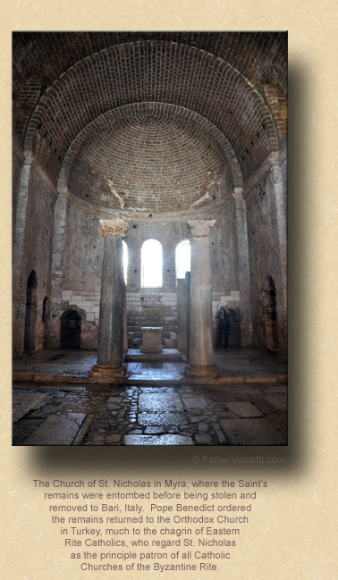 Probably no other saint has been more portrayed both in western art and eastern iconography; and many Eastern Catholic Churches, including the Ruthenian Church I served for almost twenty years, count Saint Nicholas as their patron. In fact, they have more Churches named for him than any other single saint;—I know because I was pastor of a couple of them over the years—and every icon screen they have shows his image. And yet, in spite of all of this, there are only two facts we know about him for certain: that he was bishop of a town called Myra in Asia Minor, and that he died sometime around the middle of the fourth century.
