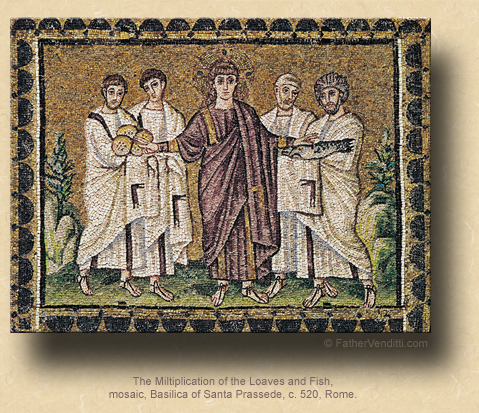 Of course, our Lord’s disciples were not thinking of these things when our Lord performed this miracle;—and He did it twice—they were probably thinking, “Gee, what a great trick. Wish I could do a trick like that.” Whether they remembered it on the night of the Last Supper we’ll never know. But they certainly remembered it later, and so did the Fathers of the Church. Saint Jerome, in the fourth century, wrote,