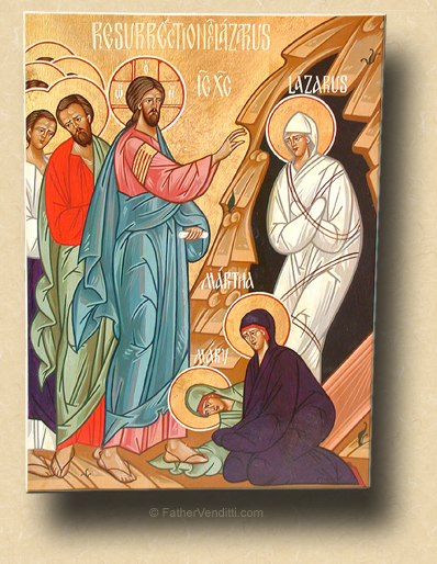 I mention all this to emphasize the unity of the Catholic Church because, as we begin the celebration of Great and Holy Week, we find that our observance of these holy days is quite different from the way the week proceeds in the Latin Church; and, perhaps the most important way our observance is different concerns the day on which it begins. The Latin Church begins Holy Week on Palm Sunday; we begin it the day before, on a day we call Lazarus Saturday. The Gospel for that day, as I'm sure you can guess, is the account of the raising of Lazarus from the dead, and for obvious reasons: the resurrection of Lazarus is a prefiguring of the resurrection of our Lord.