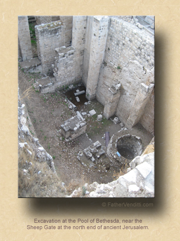 The place described in today’s Gospel lesson is unique. If we had to, we could compare it to Lourdes in France, where so many Christians have claimed to be cured at the miraculous stream. It was, in fact, a pool of some sort by one of the gates of Jerusalem. This particular site was excavated not long ago;—less than 75 years ago—and one of the men who first excavated this site was from my home town. He was a Baptist minister, and he brought back with him from this site a stone from the pool of Bethesda which, today, is visible embedded in the plaster over the archway leading into the baptistery of the First Baptist Church of Bethesda, Maryland. Hence, the town’s name.
