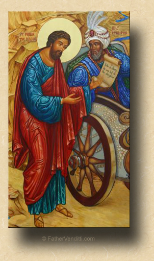 In today's apostolic lesson from Acts, Saint Luke tells us the story of one of these conversions. The Apostle Philip, running away from the persecutions in Jerusalem, encounters an Ethiopian eunuch, an official from the court of Queen Candace, who ruled Ethiopia at the time. Now, many Ethiopians, believe it or not, were Jews. It's unclear from the text whether this man was a Jew—probably he was not—or a convert to the Jewish faith, or simply someone sympathetic to the Jewish faith; but, in any case, he's sitting in his chariot taking a rest from his journey and reading the Book of the Prophet Isaiah; in fact, Saint Luke tells us exactly what passage from Isaiah he was reading, and it should sound familiar to you: it was the very passage we had looked at in detail some time ago,**—I’m sure you don’t remember—that portion of Isaiah called “The Song of the Suffering Servant,” whom the Fathers of the Church had always identified with our Lord, God and Savior, Jesus Christ. Saint Philip is very bold: he walks right up to this man, who is obviously of a much higher class than himself, and asks him if he understands what he's reading. The Ethiopian eunuch is very honest with him, and tells him, no, he doesn't really, but that he'd be very grateful if Philip could explain it to him.