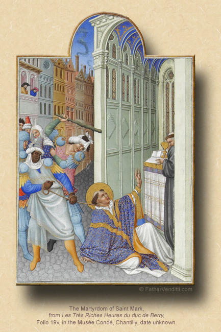 6:41 AM 4/25/2018 — Today, of course, is the feast of the Blessed Evangelist Mark, cousin of the Apostle Barnabas and close friend and collaborator of the First of the Apostles, Peter. In fact, Mark's Gospel—and we know this from the testimony of the Fathers—is essentially the Gospel according to Saint Peter, and we know this from no less a source than Saint Jerome, who knew more about the Bible than all of today's modern Scripture scholars combined. From him we learn that Mark and Peter were the best of friends, that it was at the request of Peter and the brethren in Rome that Mark wrote his Gospel; and, since he was not one of the Twelve Apostles,—though it's fairly certain that he knew our Lord personally—he based his Gospel primarily on what Peter had told him. Jerome states: “When Peter had heard this Gospel, he approved it and gave it out to be read to the Church on his authority” (On Church Writers, ch. 8). In other words, Mark's Gospel is the first book ever written to carry an imprimatur, and it came from the first Pope, himself. So, I would suggest to you that the Feast of the Blessed Evangelist Mark is the prefect opportunity for us to renew our devotion to, and to pray for, our Holy Father.