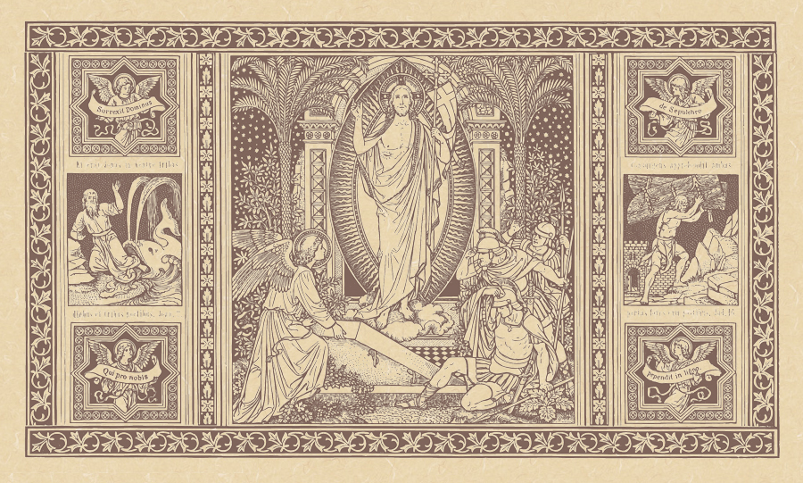 5:21 PM 4/26/2020 — It's always amazed me how popular devotion is sometimes influenced by religious art, especially in cases where the religious art may not be based on the best theology or knowledge of the Sacred Scriptures. A good case in point may be some of the images of the Resurrection of our Lord that you see sometimes on Holy Cards of just a few decades back or earlier, or engravings or prints found in old missals. I remember as a kid being very impressed with a Holy Card of the Resurrection which depicted the stone in front of the tomb broken into a million pieces, and lightening bolts shooting out of the tomb as our Blessed Lord emerged triumphantly, waving a banner with a cross on it like a battle flag, surrounded by angels blowing trumpets, with a couple of Roman centurions on the ground cowering in fear and shielding their eyes from the brightness. In fact, the banner image on my own web site for Easter is an engraving very much like that, which I used because I like the picture; but, I shouldn't have to tell you that the Resurrection wasn't anything like that.