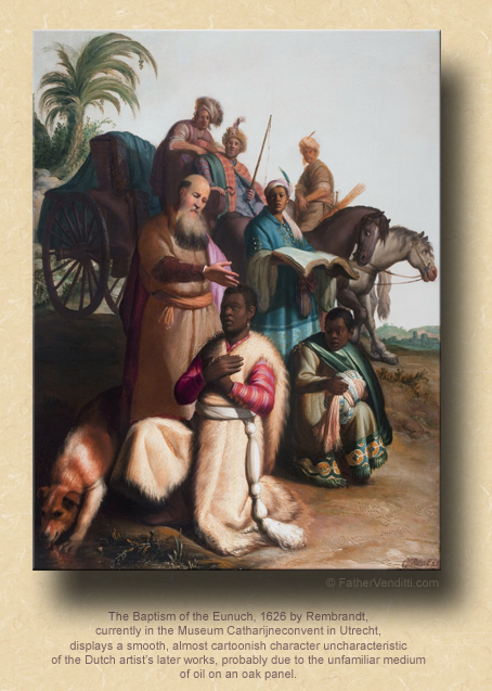 Well, that's all the impetus that the Apostle needs; beginning with that passage from Isaiah, he preaches our Lord to him, and does such a good job that the Ethiopian asks then and there to be baptized. The instant he's baptized, Philip disappears, in much the same way that our risen Lord disappeared as soon as He had offered Holy Mass for the disciples He met on the road to Emmaus. Our Lord disappeared because, with the Blessed Sacrament present, His human form was no longer needed; He was now present in the Eucharist. Philip disappears as soon as the Ethiopian is baptized because his job is now done, and he must be off to make other converts.