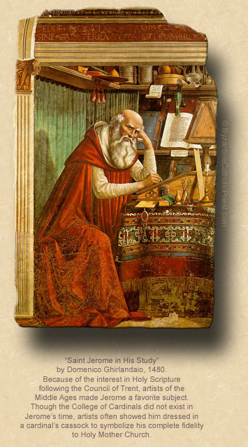 8:57 AM 9/30/2015 — Today Holy Mother Church celebrates the Memorial of the great priest and the first great Doctor of the Church from the West, Saint Jerome, who died in Bethlehem in the year of Our Lord 420. You've heard his name before: last year around this time, when the first lessons for Mass were being taken from Proverbs, I had mentioned, perhaps in a flippant way, that the reason Proverbs is in the Bible at all is because Saint Jerome put it there. While that may or may not be true in fact, what is a fact is that Saint Jerome had a lot to do with determining the make up of the Bible as we know it, even though the actual books of the Bible wouldn't be codified in a definitive way until the Council of Trent in the Middle Ages.