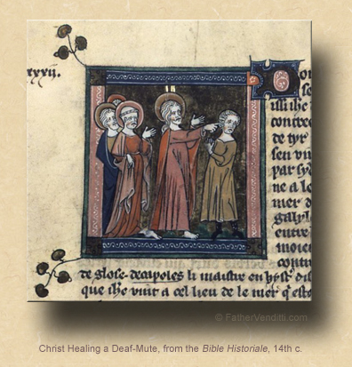 What's the next thing our Lord does? He puts His fingers into the man's ears, and with His own saliva touches his tongue. He's not doing this for some kind of dramatic effect; remember, there's no one there to see it. And it surprises me how many people are not able to recognize these actions. Ever attended the baptism of an infant? The priest touches the baby's ears and blows on his lips, and says, “May the Lord Jesus, who made the deaf hear and the dumb speak, grant that at the proper time you may hear His word and proclaim the Faith.” And here we see, in this cure, an image of how our Lord acts in our own souls: it's through the sacraments of the Church that Christ frees us from sin, opens our ears to hear the Word of God, loosens our tongues to praise and proclaim the Faith. Saint Augustine, commenting on this passage, says that the tongue of someone united to God “will speak of the Good, will bring to agreement those who are divided, will console those who weep. God will be praised, Christ will be announced” (Sermon 311, 11). A far cry from the hand-wringing that so often marks our internal turmoil during times of trial and personal struggle.